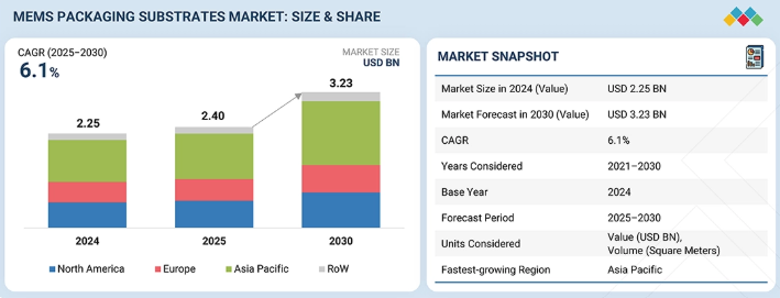 MEMSパッケージング基板市場は、2025年の24億米ドルから2030年には32億3000万米ドルに達する見込みで、この間の年平均成長率は6.1%。この成長は、小型化、熱性能の向上、ウェーハレベルパッケージングソリューションに対する需要の高まりに後押しされています。