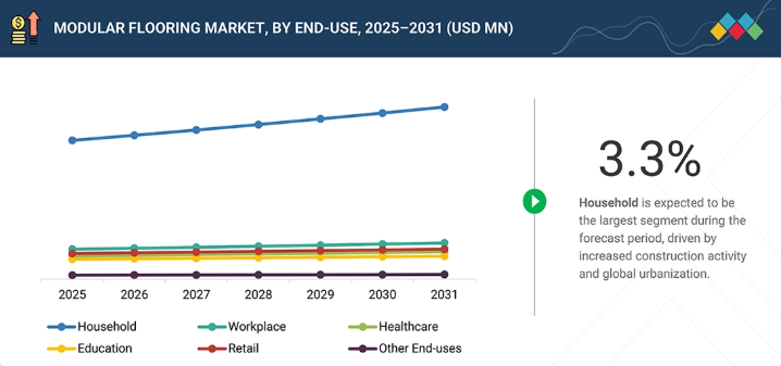 モジュラーフローリング業界では、恒久的な床材が、特定の用途向けに設計され、より迅速な床の施工、建物の段階的な改修、そして変化するワークスペースへのシームレスな統合を可能にするモジュラーフローリングシステムへと置き換わるという構造的な転換が進んでいます。高性能なモジュラーフローリングシステムは、性能面(寸法安定性、遮音性、耐摩耗性)における追加の利点に加え、スラブ下の建物の電気・機械設備へのアクセスを改善します。したがって、この構造的変革の結果として、ライフサイクルにおける混乱の低減、建物管理効率の向上、室内環境品質の向上、そしてオフィスビル、医療施設、小売店、教育施設における設計の標準化が進むことになります。建物の改修サイクルが短縮され、その用途がさらに流動的になるにつれ、幅広い環境において長期的な使用に耐える一貫した性能、持続可能性、柔軟性を求めるステークホルダーにとって、モジュラー床材システムは引き続き優先度の高い選択肢となるでしょう。