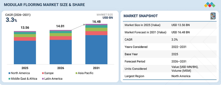 モジュラーフローリング市場は、2026年の140億1,000万米ドルから2031年までに164億8,000万米ドルへと成長すると予測されており、この期間の年平均成長率(CAGR)は3.3%となります。モジュラーフローリングへの需要は、その設置や交換の容易さに起因しており、業務への影響を最小限に抑えながら、プロジェクトをより迅速に遂行することが可能となります。
