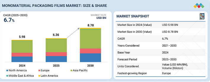 単一素材包装フィルム市場は、予測期間中に年平均成長率(CAGR)6.7%で拡大し、2025年の63億6,000万米ドルから2030年には87億8,000万米ドルに達すると見込まれています。単一素材包装フィルムへの需要の高まりは、その優れたリサイクル性に支えられており、ブランドやメーカーが、世界的に厳格化するサステナビリティおよび循環型経済に関する規制を満たす包装へと移行していることが背景にあります。