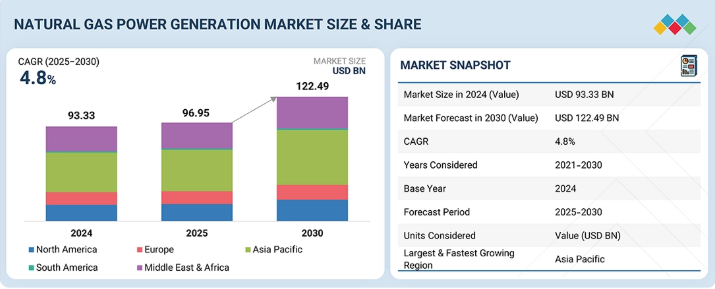 世界の天然ガス発電市場は、電力需要の増加と石炭からクリーン燃料への移行が進んでいることから、2025年から2030年にかけて年平均成長率(CAGR)4.8%で成長し、2025年の969億5,000万米ドルから2030年には1,224億9,000万米ドルに達すると予測されています。新興国における急速な都市化と工業化が導入をさらに加速させており、複合サイクルガスタービンの技術進歩が効率性、柔軟性、信頼性を高めています。支援的な政府政策とLNGインフラの拡充も市場の見通しを強化しています。さらに、天然ガスと再生可能エネルギーシステムの統合、および水素混焼技術の進歩が長期的な持続可能性を向上させています。その結果、天然ガスは低炭素発電の必要性と電力系統の安定性、エネルギー安全保障のバランスを取る重要な移行燃料として、今後もその地位を維持すると予想されます。