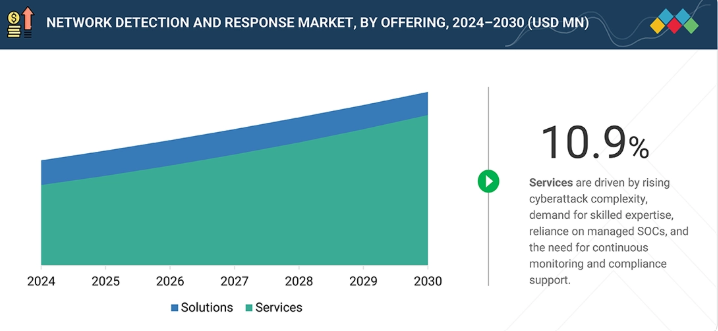 NDR市場はソリューションとサービスで構成され、企業がネットワーク全体の脅威をリアルタイムで検出、監視、対応できるよう支援します。