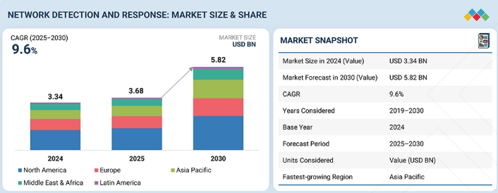 世界のネットワーク検知・応答(NDR)市場規模は、2025年の36.8億米ドルから2030年には58.2億米ドルへと、予測期間中の年平均成長率(CAGR)9.6%で拡大すると予測されています。巧妙化するサイバー攻撃、急速なクラウド導入、規制遵守要件がNDR市場の主要な促進要因です。BFSI、政府機関、ヘルスケア&ライフサイエンス、IT&通信などの業界では、可視性の向上、高度な脅威の検出、インシデント対応の自動化を目的として、NDRソリューションの導入が加速しています。NDRは、継続的なモニタリング、行動分析、ディープパケットインスペクションを提供し、隠れた脅威の発見、滞留時間の短縮、ビジネスの中断の最小化を実現します。この進化は、組織の回復力と信頼をサポートし、企業のセキュリティ・アーキテクチャへのNDRテクノロジーの統合を促進し、プロアクティブかつインテリジェンス主導のサイバーセキュリティへの幅広いシフトと連携します。