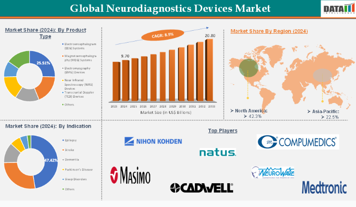 神経診断機器市場の主要グローバルプレイヤーには、日本光電工業株式会社、Natus Medical Incorporated、Compumedics Limited、Masimo Corporation、Cadwell Industries, Inc.、Medtronic、NeuroWave Systems Inc.、Neurosoft、Electrical Geodesics, Inc. (EGI)、Koninklijke Philips N.V.などが含まれる。
