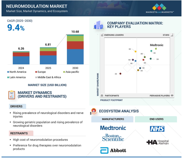 2024年に62億6,000万米ドルと評価された世界の神経調節市場は、2025年には68億1,000万米ドルとなり、2025年から2030年にかけて年平均成長率9.4%で堅調に推移し、期間終了時には106億8,000万米ドルに達すると予測されています。神経調節は、慢性疾患を管理し患者のQOLを向上させる効果的な方法として認知されつつあります。神経刺激療法は、神経学的疾患や神経関連疾患に対するコスト効率の高い長期的治療法として勢いを増しています。神経刺激装置は、脊髄と脳の間で痛みの信号を遮断することで機能し、植え込み型と非植え込み型があります。市場成長の原動力となっているのは、神経疾患や神経損傷の有病率の上昇、人口の高齢化、神経学研究に対する政府の支援や資金の増加です。先進的な神経調節技術の開発と、機器メーカー、医療提供者、研究機関の連携が、業界の成長をさらに促進しています。しかし、神経調節装置に関連する高額な処置費用や潜在的な副作用は、依然として普及の大きな障壁となっています。逆に新興国は、人口の多さ、医療費の増加、さまざまな治療領域における神経調節の適用拡大により、大きなビジネスチャンスをもたらしています。