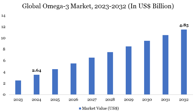 市場拡大の背景には、脳と心臓の健康増進を目的とした食事におけるオメガ3成分の使用が増加していることがあります。さらに、ヘルスケアと個人の幸福のための消費者支出の増加は、製品需要を促進すると予測されています。消費者が従来の魚油に代わるものを求めているため、市場は常に製品ソースを多様化しています。クリルオイルは、通常の魚油と比較した場合、その優れた品質のため、オメガ3の最も広く使用されるソースの一つです。