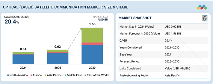 光(レーザー)衛星通信市場は、2025年の0.62億米ドルから2030年までに1.56億米ドルへ、年平均成長率(CAGR)20.4%で成長すると予測される。数量ベースでは、光(レーザー)衛星通信端末は2025年の10,791台から2030年には19,484台へ増加すると予測される。この成長は、大容量データリンクや安全な通信への需要増加、ならびに低軌道(LEO)衛星コンステレーション全体でのレーザー衛星間リンクの採用拡大によって牽引される。