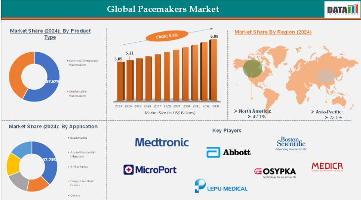 世界のペースメーカー市場は2023年に50億5,000万米ドルに達し、2024年には52億1,000万米ドルに増加。2033年までに69億9,000万米ドルに達すると予測され、2025年から2033年の予測期間において年平均成長率(CAGR)3.3%で成長する見込み。