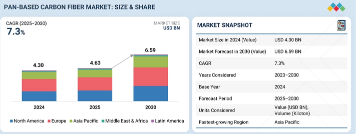 炭素繊維市場は、2025年の46億3000万米ドルから2030年までに65億9000万米ドルに達すると予測されており、2025年から2030年までの年間平均成長率(CAGR)は7.3%となる見込みである。PAN系炭素繊維市場は主に、高性能用途における軽量材料の需要増加、製造プロセスの進歩、インフラプロジェクトへの投資拡大によって牽引されている。軽量かつ高性能な材料の採用拡大により、効率性、性能、耐久性の向上のために、様々な最終用途産業においてPAN系炭素繊維の使用が進んでいる。