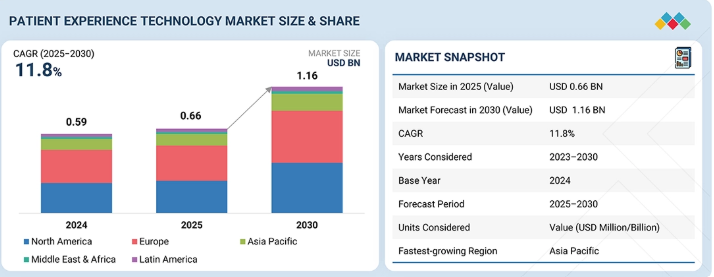 世界の患者体験技術市場は、2025年の6億6000万米ドルから2030年までに11億6000万米ドルに達し、年平均成長率(CAGR)11.8%で成長すると予測されている。この堅調な成長は、遠隔医療やAI駆動型エンゲージメントツールの導入拡大に加え、患者中心のケアとアクセシビリティを促進する政府主導のデジタルヘルス施策によるものである。