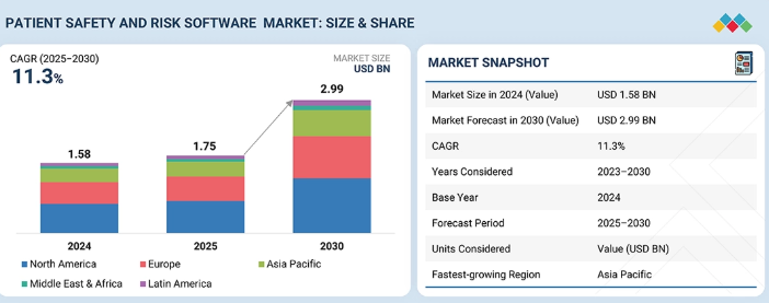 患者安全・リスク管理ソフトウェア市場は、2025年の17億5,000万米ドルから2030年までに29億9,000万米ドルに達すると予測されており、2025年から2030年までの年間平均成長率(CAGR)は11.3%となる見込みです