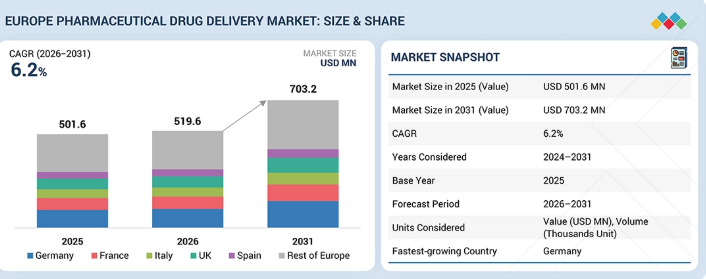 欧州の医薬品送達市場は、2025年に5億160万米ドルと評価され、2026年には5億1960万米ドルに達した。2026年から2031年にかけて堅調な年平均成長率(CAGR)6.2%で拡大し、期間末までに7億320万米ドルに達すると予測されている。欧州医薬品送達市場は、生物学的製剤およびバイオシミラーの使用拡大、慢性疾患の有病率上昇、ならびに自動注射器、プレフィルドシリンジ、吸入薬送達デバイスなどの新興送達デバイスの受容拡大に応じて成長している。さらに、高齢化、在宅医療の利用拡大、患者に優しい薬物送達システムを促進する支援的な規制政策も、この市場を牽引している。この市場の主なトレンドは、自己投与、技術主導型薬物送達、持続可能な薬物送達、薬物とデバイスの組み合わせである。
