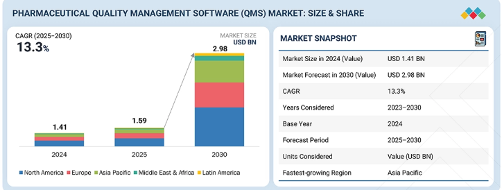 世界の医薬品品質管理ソフトウェア市場は、予測期間中に13.3%の高いCAGRで成長し、2025年の15億9000万米ドルから2030年までに29億8000万米ドルに達すると予測されています。医薬品品質管理ソフトウェア市場は、製品の安全性、規制順守、業務効率性への業界の関心の高まりを背景に、著しい牽引力を獲得しつつあります。