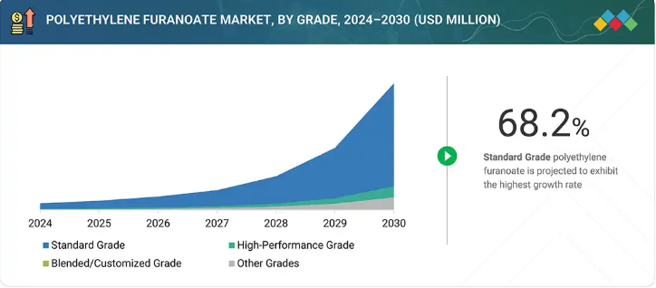 ポリエチレンフラノエートグレードの重要な傾向として、食品・飲料包装用の標準グレードの採用が増加し、より優れたバリア性と強度を持つ高機能グレードの需要が確立され、ニッチ用途向けにブレンドまたはカスタマイズされたグレードが試され、持続可能で革新的な用途が模索されています。