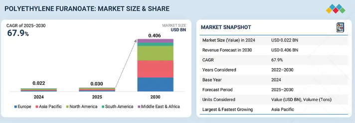 ポリエチレンフラノエート市場は、予測期間中の年平均成長率67.9%で、2025年の3,050万米ドルから2030年には4億660万米ドルに達すると予測されています。植物糖由来の2,5-フランジカルボン酸(FDCA)とエチレングリコールから重合されるポリエチレンフラノエート(PEF)は、従来のPETプラスチックに代わるバイオベースポリマーです。PEFは、その優れた機械的特性とガスバリア性、水分バリア性により、包装用途や繊維・テキスタイル用途で台頭してきており、これらすべてが持続可能性のトレンドを支えています。