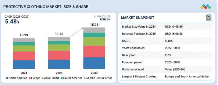 防護服市場は、2025年の115億3000万米ドルから2030年までに150億6000万米ドルに達すると予測されており、2025年から2030年までの年間平均成長率(CAGR)は5.48%となる見込みである。防護服は、火災、極度の熱、化学物質、生物学的汚染物質、機械的衝撃など、幅広い危険から作業員を保護するために設計された特殊な衣類および付属品で構成される。石油・ガス、建設、製造、医療、防衛など、危険な環境への曝露が日常的な産業において重要な役割を果たしている。市場拡大の主な要因は、職場安全規制の強化、労働者の健康への関心の高まり、先進国・新興国双方における工業化の進展である。