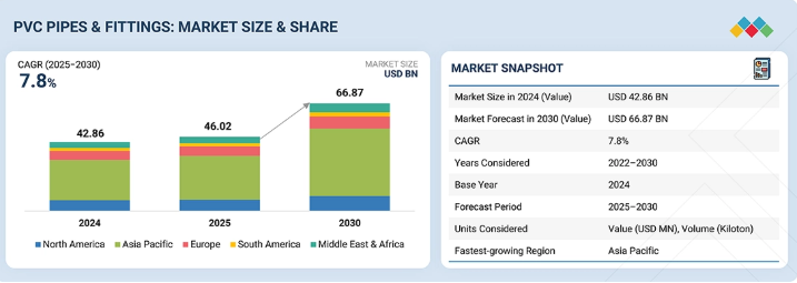 PVCパイプおよび継手市場は、2025年の460億2,000万米ドルから2030年までに668億7,000万米ドルに達すると予測されており、2025年から2030年までの年間平均成長率(CAGR)は7.8%と見込まれています。PVCパイプ・継手は、インフラ開発の拡大、都市化、効率的な水管理システムへの需要増加を背景に、堅調な成長が見込まれています。世界各国の政府は、特に清潔な水と衛生設備へのアクセスが優先課題である新興経済国において、老朽化した上下水道ネットワークの更新に多額の投資を行っています。