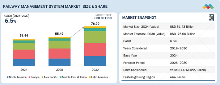 鉄道管理システム市場は、2025年の554億9320万米ドルから2030年までに760億130万米ドルに達すると予測されており、年平均成長率(CAGR)は6.5%となる見込みである。市場の成長は、より安全で効率的な鉄道運営への需要の高まり、都市化の進展、旅客・貨物輸送量の増加、老朽化したインフラの近代化ニーズによって牽引されている。デジタル化、自動化、予知保全、スマートモビリティや持続可能な交通への政府投資が導入をさらに加速させている。