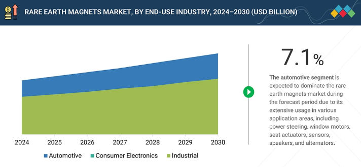 最終用途産業別では、自動車、民生用電子機器、航空宇宙・防衛、産業用、エネルギー、その他産業に分類される。電気自動車やハイブリッド車への急速な移行に伴い、自動車産業における希土類磁石の使用は増加している。
