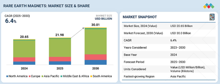 希土類磁石市場は、2025年の219億8,000万米ドルから2030年までに300億1,000万米ドルに達すると予測されており、年平均成長率(CAGR)は6.4%となる見込みである。市場はタイプ別に分類され、NdFeB磁石とSmCo磁石が含まれる。ネオジム鉄ホウ素(NdFeB)磁石は、高い磁気強度と高性能用途での有効性から人気が高まっている。これらの磁石が民生用電子機器、ロボット、風力タービン、電気自動車に採用されるにつれ、市場は拡大している。