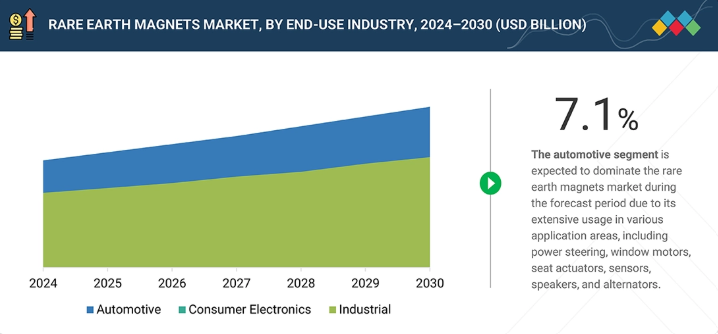 最終用途産業別では、自動車、民生用電子機器、航空宇宙・防衛、産業用、エネルギー、その他産業に分類される。電気自動車やハイブリッド車への急速な移行に伴い、自動車産業における希土類磁石の使用は増加している。