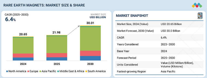 希土類磁石市場は、2025年の219億8000万米ドルから2030年までに300億1000万米ドルに達すると予測されており、年平均成長率(CAGR)は6.4%となる見込みである。市場はタイプ別に分類され、NdFeB磁石とSmCo磁石が含まれる。ネオジム鉄ホウ素(NdFeB)磁石は、高い磁気強度と高性能用途での有効性から人気が高まっている。これらの磁石が家電製品、ロボット、風力タービン、電気自動車に採用されるにつれ、市場は拡大している。