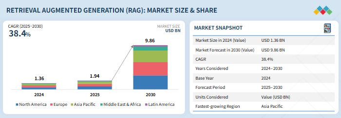 検索機能拡張世代(RAG)市場は、2025年の19億4,000万米ドルから2030年には98億6,000万米ドルに拡大し、予測期間中のCAGRは38.4%と予測されています。RAGとは、外部の知識検索を統合することで大規模言語モデル(LLM)の機能を強化し、生成される出力の精度、関連性、文脈を認識する能力を向上させる技術、サービス、ソリューションのエコシステムを指します。この市場には、ベクターデータベース、クラウドベースのRAGプラットフォーム、チャットボット、セマンティック検索エンジン、知識管理システムなどのアプリケーションをサポートするエンタープライズAIツールなど、さまざまな製品が含まれます。RAG市場の成長は、主にエンタープライズAIシステムの急速なデジタルトランスフォーメーションが世界的な原動力となっています。