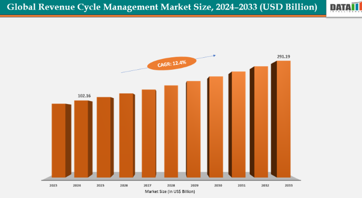 世界の収益サイクル管理市場規模は、2024年に1,021億6,000万米ドルに達し、2033年には2,911億9,000万米ドルに達すると予測され、予測期間2025年〜2033年のCAGRは12.4%で成長する見込みです。同市場の主な原動力は、医療費請求・償還プロセスの複雑化、管理コストの上昇、ワークフローの合理化、エラーの削減、収益回収の迅速化を実現するデジタルおよびAI対応ソリューションの採用です。