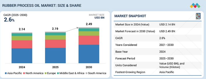 世界のゴム加工油市場は、予測期間中に年平均成長率(CAGR)2.6%で成長し、2025年の21億9,000万米ドルから2030年までに24億9,000万米ドルに達すると予測されている。ゴム加工油は、粘度を低下させ、充填剤の分散性を向上させ、より滑らかな押出成形と成形を支援することで、天然ゴムおよび合成ゴムコンパウンドの加工性、混練性、性能特性を改善するために使用される特殊油である。市場は、処理済み留分芳香族抽出物(TDAE)、留分芳香族抽出物(DAE)、軽抽出溶媒(MES)、残留芳香族抽出物(RAE)、処理済みRAE(TRAE)に加え、パラフィン系およびナフテン系オイルなど、互換性と目的の最終製品特性に基づいて選択される複数の製品タイプで定義される。これらの油はさらに粘度(低粘度、中粘度、高粘度グレード)によって細分化され、メーカーは柔軟なエラストマーから高密度・高強度ゴム製品まで、加工特性を調整可能とする。用途面では、ゴム加工油はタイヤ、油延長ポリマー、工業用ゴム製品、熱可塑性エラストマー(TPE)、その他一貫した加工性と機械的性能が不可欠な下流ゴム製品に広く使用される。これらのセグメントが総合的にRPO市場の中核構造を形成している。世界的なタイヤ生産量の増加、合成ゴム製造の拡大、そしてより厳しい環境・性能要件を満たす低PAH(多環芳香族炭化水素)および特殊RPOグレードへの業界の移行が進んでいることから、需要は引き続き増加している。
