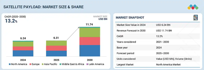 衛星搭載物のグローバル市場規模は2025年に63.1億ドル、2030年までにCAGR 13.2%で拡大する見通し