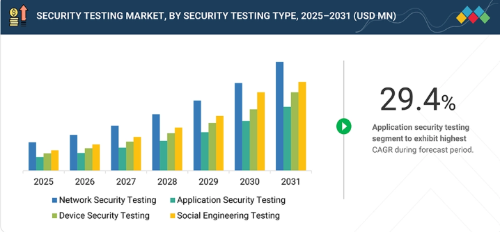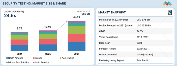 セキュリティテスト市場は、2025年の109億6,000万米ドルから2031年までに409億9,000万米ドルに達すると予測されており、2025年から2031年までの年間平均成長率(CAGR)は24.6%と見込まれています。ウェブおよびモバイルアプリケーションの導入率の高さが市場を牽引しており、アプリケーションの攻撃対象領域を拡大し、組織をサイバー攻撃に悪用される可能性のあるより多くの脆弱性に晒しています。これにより、組織は継続的なセキュリティテストへの投資を迫られています。同時に、サードパーティ製およびオープンソースコンポーネントの利用増加は、ソフトウェアサプライチェーンリスクも生み出しています。外部ライブラリの脆弱性がアプリケーションに持ち込まれる可能性があるためです。このため、開発プロセスの全段階でこれらの脆弱性を検出、評価、対処するためのセキュリティテストソリューションの利用が必要となる場合があります。