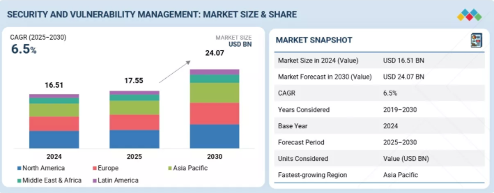 セキュリティおよび脆弱性管理市場は、2025年の175億5000万米ドルから2030年までに240億7000万米ドルに達すると予測されており、2025年から2030年までの年間平均成長率(CAGR)は6.5%となる見込みです。市場の成長は、世界的な脆弱性の増加、サードパーティ製アプリケーションの導入拡大、高度な脆弱性管理ソリューションの不足による金銭的損失や重要データの損失の深刻化によって牽引されている。