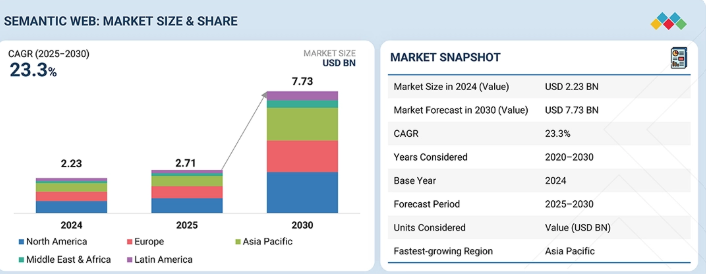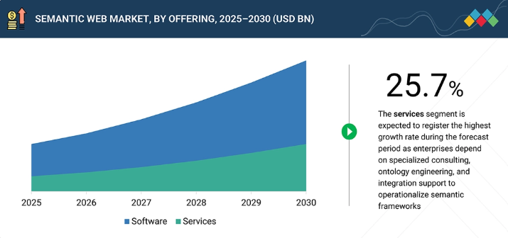 セマンティックウェブ市場は、2025年の27億1000万米ドルから年平均成長率(CAGR)23.3%で拡大し、2030年までに77億3000万米ドルに達すると予測されている。市場の拡大は、AI、IoT、企業分析を支えるインテリジェントなデータ接続性、オントロジー駆動型ガバナンス、機械可読ウェブアーキテクチャへの需要増加によって牽引されている。様々なエンドユーザー産業が、断片化されたデータの統合、相互運用性の強化、デジタルエコシステム全体でのコンテキスト認識型自動化の実現に向けてセマンティック技術への投資を進めています。