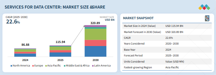 データセンター向けサービス市場は、高度なインフラ管理、データセキュリティの強化、拡張可能なデジタルエコシステムに対する需要の高まりを背景に、堅調な成長を遂げています。2025年の市場規模は1,159億4,000万米ドル、2030年には3,208億9,000万米ドルに達すると予測され、2025~2030年の予測期間中の年平均成長率は22.6%です。この成長を支えているのは、クラウドコンピューティングの採用が加速していること、デジタルトランスフォーメーションへの取り組みが進んでいること、業界全体でデータ駆動型業務への依存度が高まっていることです。北米とアジア太平洋地域は、ハイパースケール施設に対する多額の投資、ITワークロードの増加、政府が支援するデジタル化プログラムに後押しされ、最も急成長する地域と予測されます。データセンター市場では、信頼性の高いインフラ、エネルギー効率の高い運用、高度なデジタル機能に対する企業のニーズが高まっており、ファシリティおよびITサービスの成長が予測されます。クラウド、AI、エッジコンピューティングの導入拡大により、アウトソーシング、近代化、マネージドサービスのニーズが高まり、スケーラビリティ、コンプライアンス、運用継続性が確保されます。