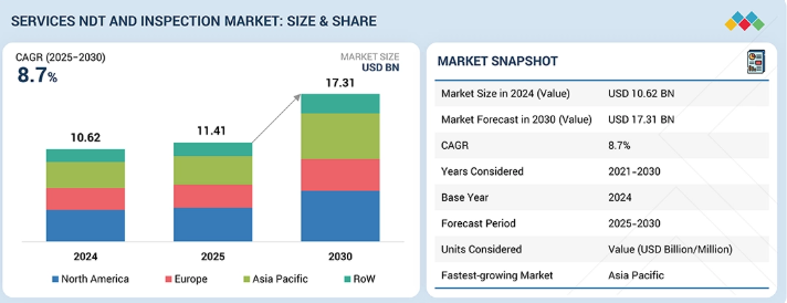非破壊検査(NDT)および点検サービス市場は、2025年の114億1000万米ドルから2030年までに173億1000万米ドルに達すると予測されており、2025年から2030年までの年間平均成長率(CAGR)は8.7%となる見込みです。産業がますます複雑化するインフラ全体で資産保全、安全コンプライアンス、稼働時間の確保を優先する中、非破壊検査(NDT)および点検サービス市場は急速に成長しています。予知保全および状態監視型保全の導入拡大により、事業者は高度で継続的な検査サービスへの依存度を高めている。自動超音波検査(UT)、デジタル放射線撮影、ドローン、分析プラットフォームによるデジタルトランスフォーメーションは、欠陥検出の高速化・高精度化を実現し、需要をさらに加速させている。加えて、老朽化する産業資産と厳格化する規制枠組みが、エネルギー、製造、輸送、公共インフラ各セクターにおける長期的なサービス需要を牽引している。