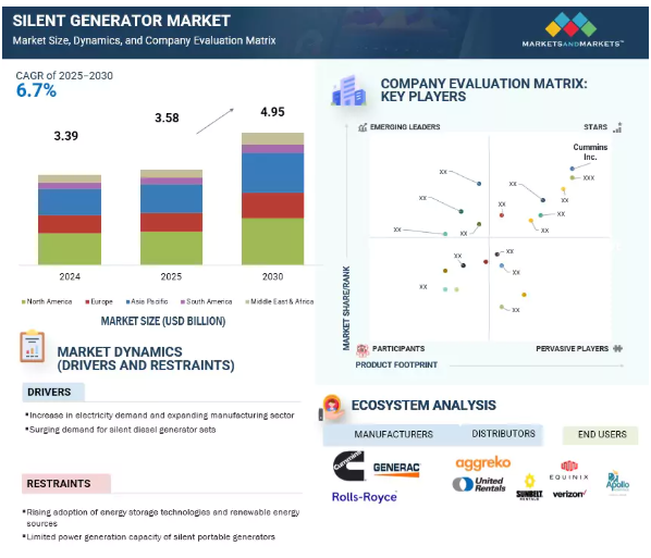 世界の静音発電機市場は、2025年に35億8000万米ドルと推定され、2030年には年平均成長率6.7%で49億5000万米ドルに達すると予測されています。静音発電機市場の成長は、持続可能性、デジタル化、都市エネルギーの回復力といった新たなトレンドが牽引しており、メーカーとエンドユーザー双方に新たな機会を創出しています。排出ガスと騒音レベルの低減を求める規制圧力の高まりにより、ハイブリッド発電機や天然ガス発電機の採用が加速しており、従来のディーゼルモデルからの明確な移行が進んでいます。同時に、IoT対応の監視、自動化、遠隔制御の進歩は、よりスマートで効率的な電力管理ソリューションを提供することで、顧客の期待を再構築しています。都市化の進展、スマートホームの普及、データセンターや医療施設の拡大により、ノイズのない信頼性の高いバックアップ電源への需要が高まっています。さらに、異常気象の頻度の増加や送電網インフラの老朽化により、バックアップ電源システムへの新たな投資が促進され、静音発電機が世界的に持続可能で回復力のあるエネルギー戦略の重要な要素として位置付けられています。