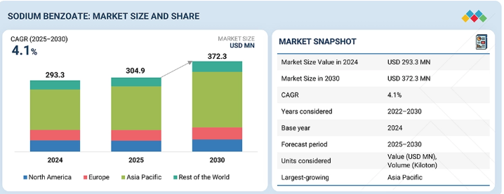 ベンゾ酸ナトリウム市場は、2025年の3億490万米ドルから2030年までに3億7230万米ドルに達すると予測されており、2025年から2030年までの年間平均成長率(CAGR)は4.1%となる見込みである。本市場は、食品・飲料をはじめとする複数産業における保存料としての広範な使用に牽引されている。特に包装済み・即食・長期保存可能製品への需要増加が消費を大幅に押し上げている。