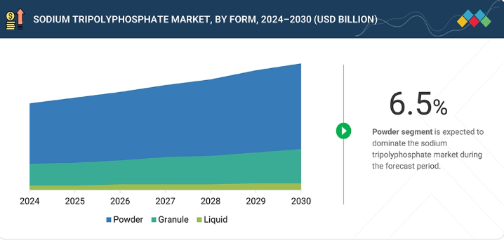 STPP市場の主要形態には粉末、顆粒、液体が含まれる。粉末形態セグメントは、優れた溶解性、取り扱い容易性、ならびに洗剤、食品加工、水処理産業における広範な応用により、予測期間中最大の規模を維持すると予想される。