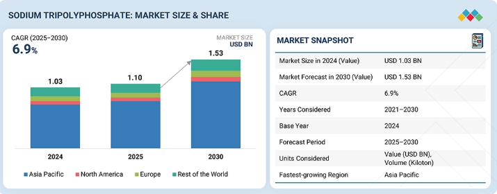 世界のトリポリリン酸ナトリウム(STPP)市場は、2025年の11億米ドルから2030年までに15億3000万米ドルへ成長し、この期間の年平均成長率(CAGR)は6.9%と予測される。STPP市場のこの成長は、主に洗剤、水処理、食品加工産業など様々な分野からの需要増大によって牽引されている。特にアジア太平洋地域の発展途上国における家庭用・工業用洗浄剤の消費増加が、この成長に大きく寄与している。さらに、工業用水軟化剤や金属封鎖剤の需要も市場拡大を後押しすると予測される。リン酸塩に関する環境懸念や規制はあるものの、環境持続可能な配合や代替STPP製造法に焦点を当てた研究開発の継続が、長期的な市場成長を支える見込みである。