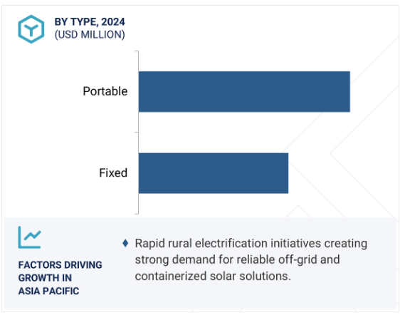 タイプ別では、長期設置に適していること、農村部の電化やコミュニティプロジェクトでの需要が高まっていること、大規模展開におけるコスト効率が高いことなどから、予測期間中、固定型セグメントのCAGRは携帯型セグメントよりも高くなる見込み。固定式ソーラーコンテナは、継続的で信頼性の高い電力供給を保証するため、常設設置に適しており、学校、病院、農場、産業にとって非常に魅力的であるため、導入が加速しています。政府やNGOは、村落や灌漑システムの電力供給用に固定式コンテナを導入するケースが増えており、農村部の電化や地域開発イニシアチブにおいて、拡張性のある強い需要を生み出しています。また、運用コストが低く、寿命が長いため、常設用としてより経済的であり、大規模展開におけるコスト効率も高くなっています。