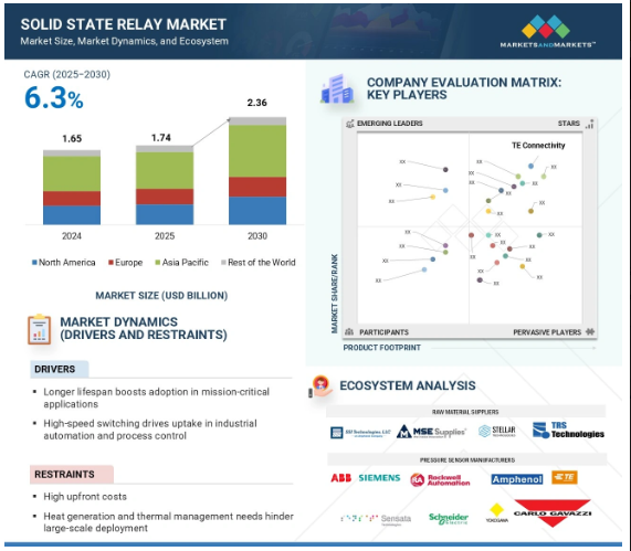 ソリッドステートリレーの世界市場規模は2024年に16.5億米ドルと推定され、2025年の17.4億米ドルから2030年には約23.6億米ドルに増加し、2025年から2030年までの年平均成長率は6.3%で拡大すると予測されています。ソリッドステートリレー(SSR)市場は、産業オートメーション、OEM、自動車、エネルギーなどの用途で、信頼性が高く、効率的で、メンテナンスフリーのスイッチングソリューションに対する需要の高まりが原動力となっています。SSRは寿命が長く、スイッチング速度が速く、衝撃や振動に強いため、オートメーション、産業機械、建築設備に最適です。電気自動車(EV)、再生可能エネルギー統合、スマートグリッドの成長により、大電流スイッチング、温度制御、インバータアプリケーション向けのSSRの採用が加速しています。エネルギー効率とコンパクトな電子設計への注目が高まるにつれ、SSRの需要はさらに高まっています。さらに、SSRは、ノイズのない正確な動作が重要な医療機器、食品・飲料加工、HVACシステムで重要な役割を果たしています。デジタル化およびインダストリー4.0に伴う産業オートメーションの拡大により、プログラマブルロジックコントローラ(PLC)、ロボット工学、通信システムでの使用が加速しています。さらに、半導体材料の技術進歩やコストの低下により、SSRの競争力が高まり、世界的な市場浸透がさらに拡大しています。