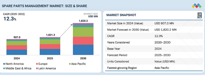 スペアパーツ管理市場は、2025年の10億2130万米ドルから2030年までに18億2020万米ドルに達すると予測されており、年平均成長率(CAGR)は12.3%となる見込みです。スペアパーツ管理市場の成長は、MRO(保守・修理・オーバーホール)業務の拡大、リアルタイム在庫最適化のニーズ、高度なサービスパーツ計画への移行によって牽引されている。企業は、部品の可用性向上、サービス遅延の削減、グローバルサービスネットワーク全体でのサプライチェーン可視性の強化を図るため、AIを活用した需要予測、予知保全、インテリジェント在庫管理を導入している。