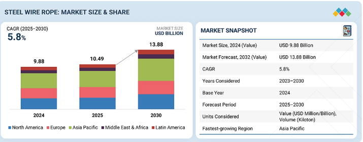 鋼製ワイヤーロープ市場は、2025年の104億9000万米ドルから2030年までに138億8000万米ドルに達すると予測されており、年平均成長率(CAGR)は5.8%となる見込みである。世界の鋼製ワイヤーロープ市場は、主に世界的なインフラ整備と建設活動の増加、特に都市開発が急速に進む新興経済国において牽引されている。建設、鉱業、石油・ガス、海洋などの分野では、重量物の吊り上げ、巻き上げ、リギングに鋼製ワイヤーロープが不可欠であるため、需要が特に強い。この材料の高い引張強度、耐久性、耐食性は、これらの用途において不可欠な要素となっている。国家インフラ計画や大規模産業プロジェクトなどの政府主導の施策も、需要をさらに刺激している。