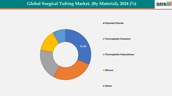 素材別のポリ塩化ビニル(PVC)セグメントは、2024年に31.3%のシェアを占め、外科用チューブ市場を支配しています