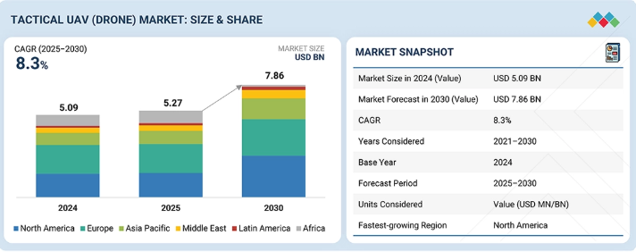 戦術用無人航空機(ドローン)市場は、2025年の52億7000万米ドルから2030年までに78億6000万米ドルに達すると予測され、年平均成長率(CAGR)は8.3%となる見込みである。地政学的緊張の高まりに伴う安全保障リスクの変化に対応するため、防衛機関がより優れたISR(情報・監視・偵察)能力への投資を進める中、任務準備態勢と作戦効果の向上を目的とした戦術用UAVの導入が加速しており、市場は成長している。