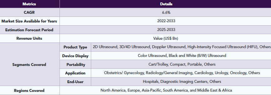 世界の超音波診断市場は2024年に82億7,000万米ドルに達し、2033年までに156億6,000万米ドルに達すると予測されており、2025年から2033年の予測期間において年平均成長率(CAGR)6.6%で成長すると見込まれています。