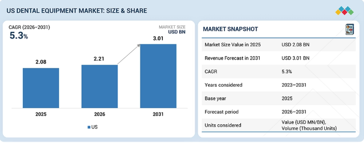 米国の歯科機器市場は、2025年に20億8000万米ドルと評価され、2026年には22億1000万米ドルに達した。2026年から2031年にかけては5.3%という堅調なCAGRで成長し、期間終了時には30億1000万米ドルに達すると予測されている。歯科機器は、歯科診療における口腔健康問題の特定・治療・管理を支援するために設計された多様な医療技術を包括する。こうした装置は治療用機器とも呼ばれ、歯科用チェア、歯科ユニット、歯科用画像診断システム・デジタルX線装置・CBCTスキャナーなどの診断技術を含む。歯科用機器は、その目的に応じて、日常的な歯科治療用の一般的な器具から、高度に専門的な処置を可能にする先進システムまで多岐にわたります。これらの製品は、歯科病院やクリニックにおいて効率的で安全かつ高水準の患者ケアを提供するために不可欠です。