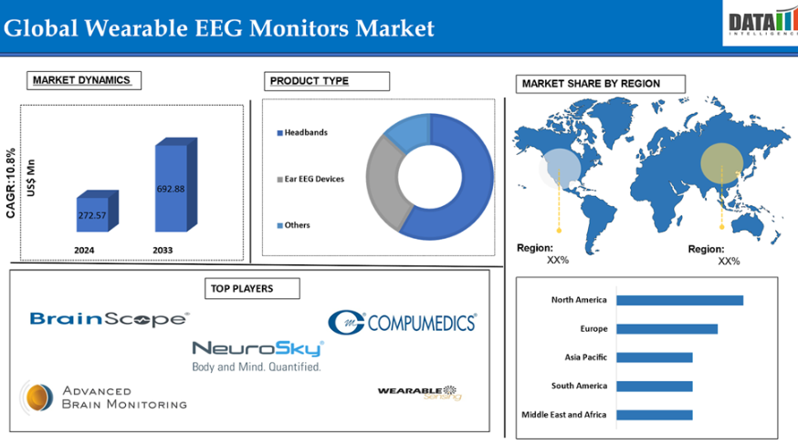 DataM Intelligenceのレポートによると、世界のウェアラブルEEGモニター市場は2024年に2億7,257万米ドルに達し、2033年までに6億9,288万米ドルに達すると予想されています。2025年から2033年の予測期間中は、年平均成長率(CAGR)10.8%で成長すると見込まれています。
