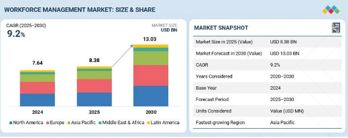 世界の労働力管理市場は、製造業や企業が労働力の複雑化、厳格化するコンプライアンス要件、限られた人員で生産性を向上させる圧力に直面する中、2025年の83億8000万米ドルから2030年までに130億3000万米ドルへと著しい成長を遂げており、年平均成長率(CAGR)は9.2%に達する見込みである。企業は、特に業界全体でスキル不足が深刻化する中、スケジューリング、勤怠管理、需要予測、労働力最適化を効率化するためWFMツールを導入している。デジタルトランスフォーメーション、自動化、AI駆動型意思決定への推進が、WFM導入をさらに加速させている。クラウドベースのプラットフォームは、迅速な導入と初期コスト削減により採用を拡大している。加えて、ハイブリッド勤務モデルや複数シフト制の運用が、リアルタイムの労働力可視性とより優れたリソース配分への需要を牽引している。