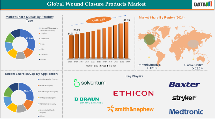 世界の創傷閉鎖製品市場は、2023年に242億3,000万米ドルに達し、2024年には254億9,000万米ドルに増加し、2033年までに417億6,000万米ドルに達すると予想されており、2025年から2033年の予測期間中に年平均成長率(CAGR)5.5%で成長する見込みです。